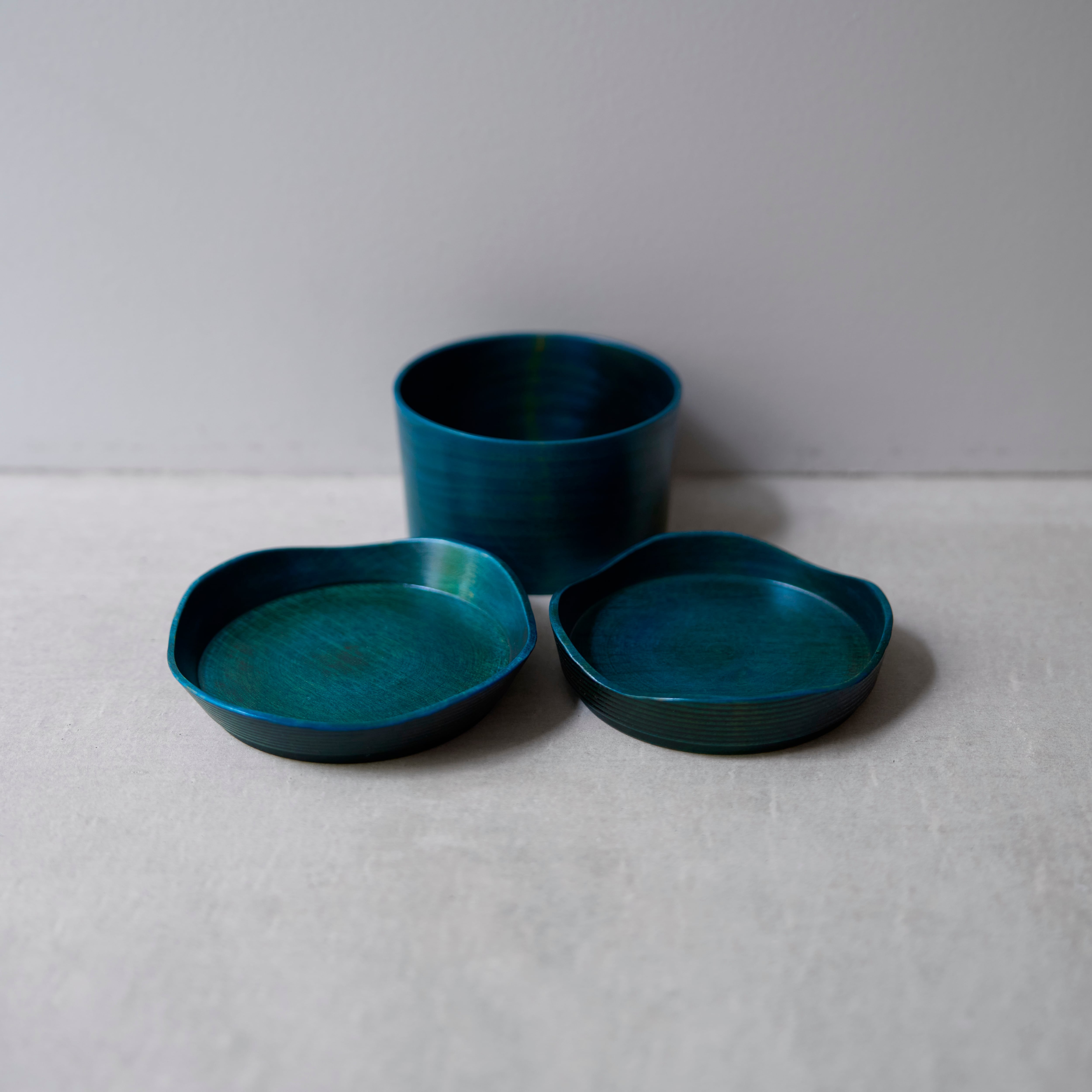 縁の部分には「千筋」と呼ばれる細かい縞模様の装飾を加えています。蓋は2枚のお皿に、本体は器に。用途にあわせて分けて使えるのが魅力です。